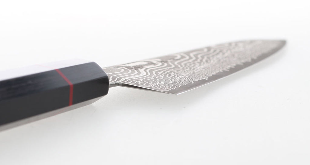 Namishibuki translates as 'wave splash' and this has been replicated in the pattern of the 101 layers of damascus steel. A special surface treatment has been given to the blade to further accentuate the contrast between the hard and soft layers of steel but also to allow the blade to slip through foods with less resistance.